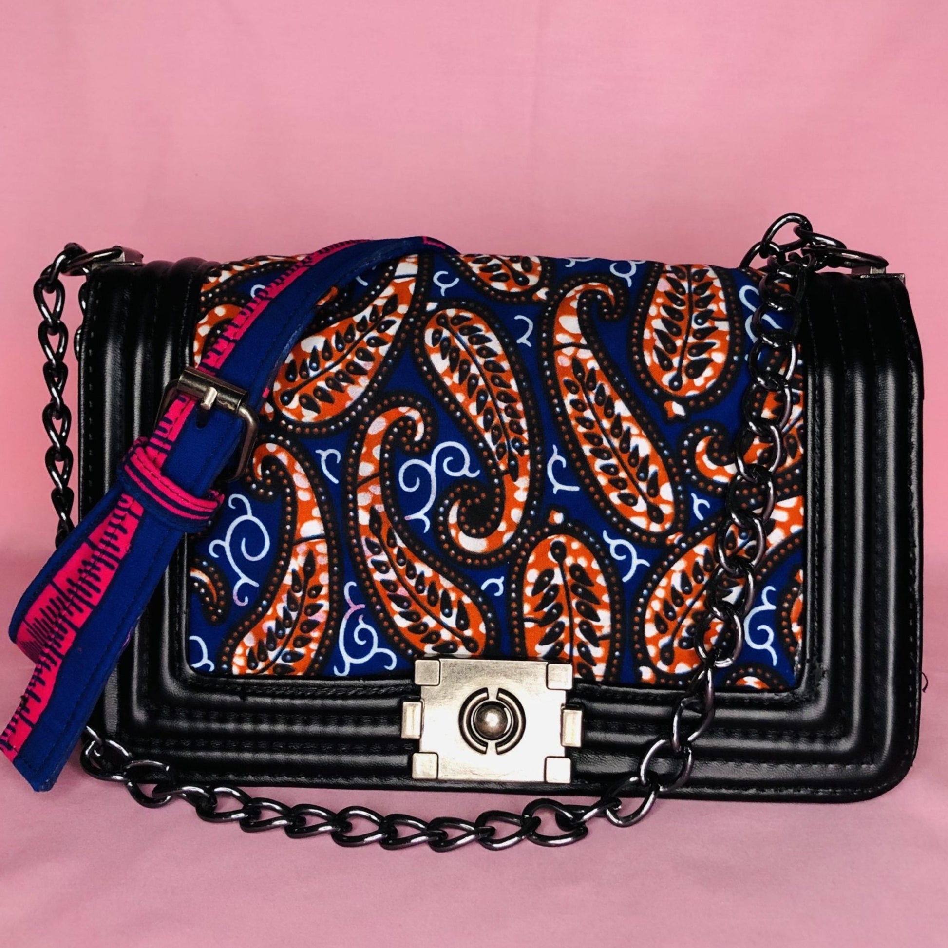 Our Lux Ankara Bag is made of faux leather. Handmade with a touch of African wax print. The perfect accessory for the city girls on the run.