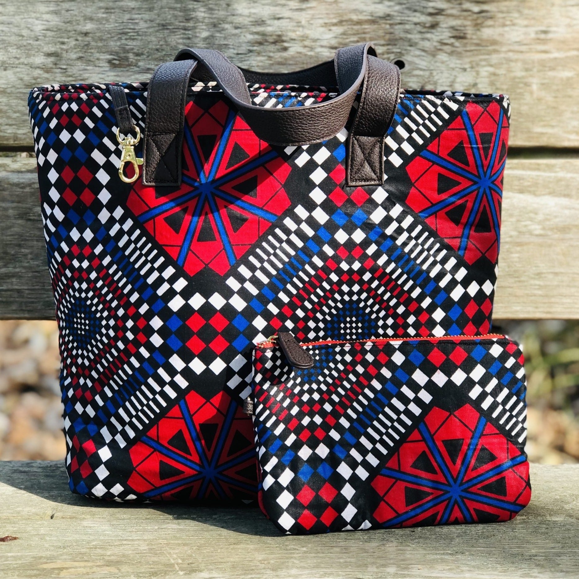 African print tote bag Made in the Cameroon. Comes with a detachable wallet. 100% African wax cotton Care Instructions Not suitable for machine wash. Do not tumble dry, Do not wring, Hand wash only Cold water only Press with cool iron Iron inside out The color may be slightly different due to lightening.